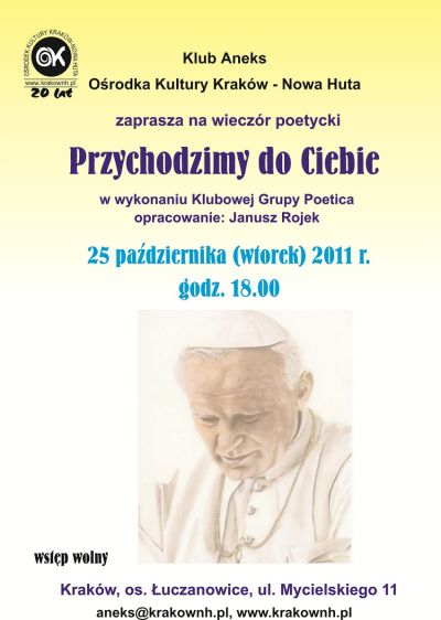 Klub Aneks Ośrodka Kultury Kraków-Nowa Huta (ul. Mycielskiego 11) zaprasza 25 października (wtorek) 2011 r. o godz. 18.00 na wieczór papieski poświęcony osobie Jana Pawła II.