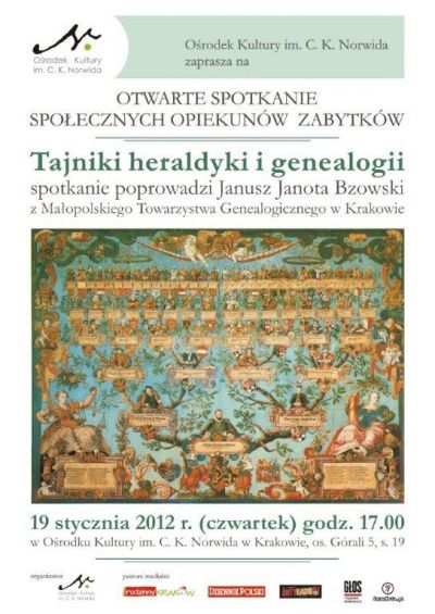 Zapraszamy na otwarte spotkanie miłośników historii i społecznych opiekunów zabytków poświęcone tematyce genealogii i heraldyki. Naszym gościem będzie p. Janusz Janota Bzowski, członek Małopolskiego Towarzystwa Genealogicznego w Krakowie.