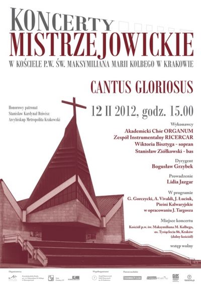 Cantus Gloriosus to kolejny z nowego cyklu Koncertów Mistrzejowickich – projektu realizowanego przez Klub „Kuźnia” Ośrodka Kultury im. C.K. Norwida, dzięki życzliwości Parafii pod wezwaniem św. Maksymiliana Marii Kolbego i pomocy Rady Dzielnicy XV.
