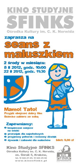 Podczas cyklu SEANS Z MALUSZKIEM proponujemy wspólne, dopołudniowe projekcje dobrych filmów, na które zapraszamy rodziców wraz z dziećmi gwarantując szczególnie dobrany repertuar (kino o wysokich walorach zdjęciowych i muzycznych, bez scen przemocy), zaplecze organizacyjne przyjazne rodzicom (przewijak dla najmłodszych, bezpieczne miejsce na wózki oraz możliwość pozostawienia dzieci w wieku 1.5 - 4 lat pod opieką w pomieszczeniach obok kina) a także przyjemny półmrok na sali kinowej i ściszony dźwięk dla tych rodziców, którzy zechcą oglądnąć film w towarzystwie swojej pociechy. Spotkania odbywają się w Kinie Sfinks dwa razy w miesiącu, w godzinach dopołudniowych.