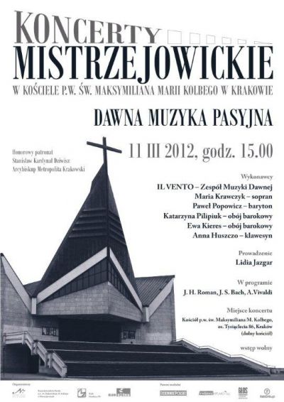 Muzyka wymienionych i innych kompozytorów zabrzmi w marcu br. w czterech nowohuckich świątyniach: Bazylice oo. Cystersów w Mogile, Kościele pw. św. Maksymiliana Marii Kolbego w Mistrzejowicach, Kościele Matki Bożej Częstochowskiej na os. Szklane Domy, Kościele Matki Bożej Nieustającej Pomocy na os. Bohaterów Września.
