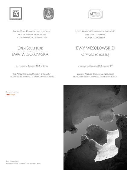 Galeria ARTEMIS serdecznie zaprasza na wystawę rzeŸby Ewy Wesołowskiej pt. "Otworzyć rzeŸbę", której wernisaż odbędzie się 8 marca o godzinie 18.00. Ekspozycja trwać będzie do 27 marca br.