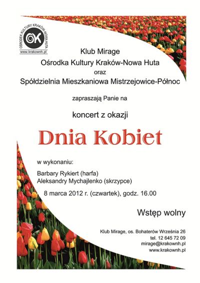 Klub Mirage Ośrodka Kultury Kraków-Nowa Huta (os. Bohaterów Września 26) zaprasza seniorów na koncert, który odbędzie się 8 marca (czwartek) 2012 r. o godz. 16.00.