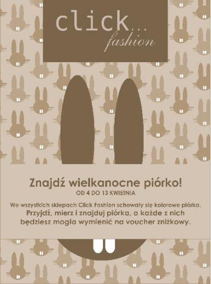 W dniach od 4 do 13 kwietnia w sklepach Click Fashion na terenie Krakowa odbędzie się Wielkanocna akcja szukania kolorowych piórek. Każdy kto w tych dniach znajdzie schowane w sklepie piórko, może zgłosić się z nim do kasy, by do zakupów otrzymać rabat.