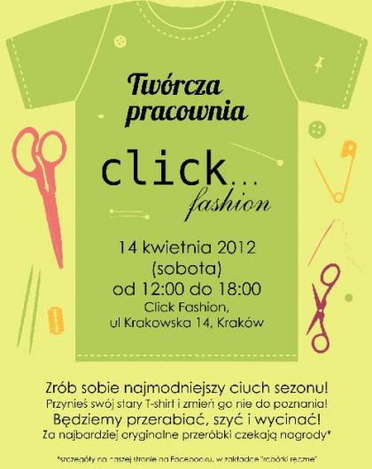 14 kwietnia sklep Click Fashion zamieni się w Twórczą Pracownię! Weź rzeczy, które już Ci się znudziły, zaproś koleżanki i puśćcie wodze fantazji. Na miejscu będą czekać na Was igły, nici, guziki, tasiemki i skrawki materiałów.