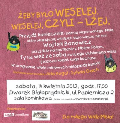 Promocja najnowszej książki Wojciecha Bonowicza połączona ze spotkaniem dla dzieci. Bajki Misia Fisia to takie małe historyjki, żeby było weselej. Weselej, czyli – lżej.