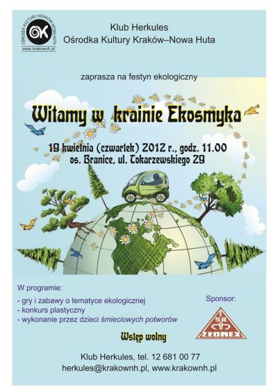 Klub Herkules Ośrodka Kultury Kraków-Nowa Huta (ul. Tokarzewskiego 29) zaprasza dzieci na festyn ekologiczny, który odbędzie się 19 kwietnia (czwartek) 2012 r. o godz. 11.00. Zakończenie imprezy ok. godz. 13.00