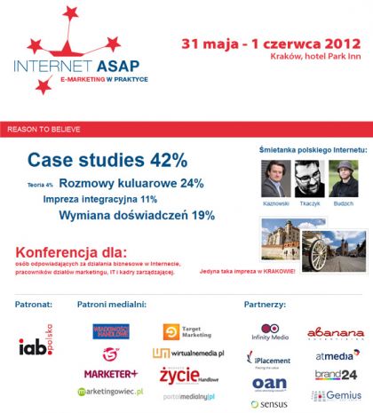Więcej informacji o konferencji I rejestracja na www.internetasap.pl oraz na Facebooku (https://www.facebook.com/InternetASAP).