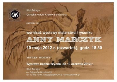 Klub Mirage Ośrodka Kultury Kraków-Nowa Huta (os. Bohaterów Września 26) zaprasza do Galerii M Plus na kolejny wernisaż. Tym razem swoje prace będzie prezentowała Anna Marczyk.