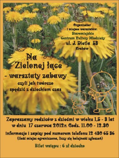 Warsztaty „Na zielonej łące” przygotowane zostały z myślą o rodzicach najmłodszych dzieci. Ich zadaniem jest podkreślenie znaczenia wspólnej, rozwijającej i budującej więź z dzieckiem zabawy. Chcemy zainspirować dorosłych pokazując jak w prosty, niedrogi i przyjemny sposób odkrywać z dzieckiem świat.
