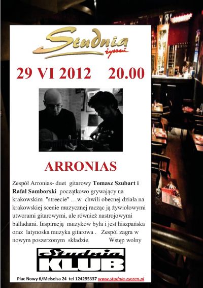 Zespół Arronias- duet gitarowy Tomasz Szubart i Rafał Samborski początkowo grywający na krakowskim "streecie" …w chwili obecnej działa na krakowskiej scenie muzycznej racząc ją żywiołowymi utworami gitarowymi, ale również nastrojowymi balladami. Inspiracją muzyków była i jest hiszpańska oraz latynoska muzyka gitarowa . Zespól zagra w nowym poszerzonym składzie. Wstęp wolny