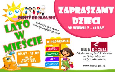 Zajęcia w ramach „Akcji Lato” odbywać się będą od poniedziałku do piątku w godz. 10:00-14:00. Zapraszamy do zapoznania z regulaminem zapisów na stronie: www.kuznia.edu.pl.