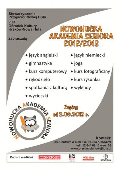 Po okresie wakacyjnego odpoczynku Nowohucka Akademia Seniora wznawia swoją działalność na rzecz seniorów. Od jesieni wszystkie osoby zainteresowane rozwijaniem i poszerzaniem swoich zainteresowań, pasji i umiejętności oraz poszukujące nowych i ciekawych form aktywności, będą mogły skorzystać z oferty edukacyjno – kulturalnej Akademii.