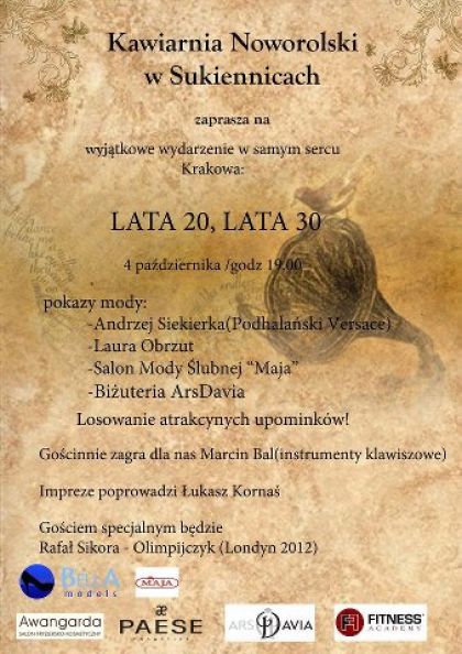 Projekty autorstwa Andrzeja Siekierki, nazywanego Podhalańskim Versace, Laury Obrzut oraz Ewy Nieć, projektującej biżuterię ArsDavia połączyła miłość do Krakowa lat 20 minionego wieku stąd czwartkowy wieczór macie szansę spędzić nucąc pod nosem "Lata 20, lata...30 były dla marzeń naszych pretekstem". Wieczór w stylu retro rozpocznie się pokazem mody ślubnej.