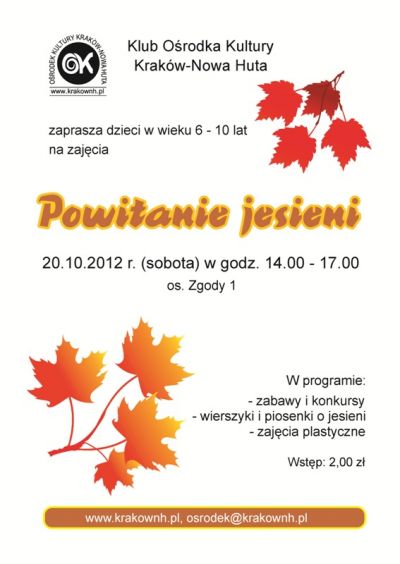 Klub Ośrodka Kultury Kraków-Nowa Huta (os. Zgody 1) zaprasza 20 października 2012 r. (sobota) w godz. 14.00-17.00na imprezę z okazji nadejścia jesieni.