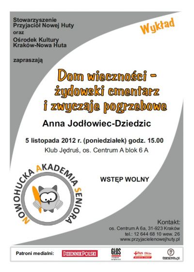 Prelekcja wygłoszona przez Annę Jodłowiec-Dziedzic - kustosz Muzeum Historycznego Miast Krakowa - dotyczyć będzie zagadnień życia wiecznego w judaizmie oraz zwyczajów pogrzebowych, od czasów biblijnych, poprzez średniowiecze, po czasy rozbiorów na ziemiach polskich. Prowadząca opowie także o rodzajach nagrobków oraz symbolice nagrobnej tj. znaczenie świec, kamieni i karteczek na grobach.
