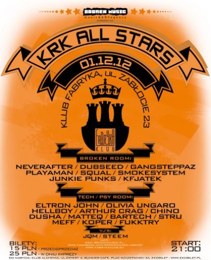 Broken Music zaprasza na KRK ALL STARS! Balangę, która jest podziękowaniem dla publiki, dji, składów, ekip, kolektywów – po prostu twórców naszej krakowskiej sceny muzycznej. W 3 salach klubu Fabryka wystąpią postacie związane z różnymi gatunkami muzycznymi, których jedynym wspólnym mianownikiem jest pasja.