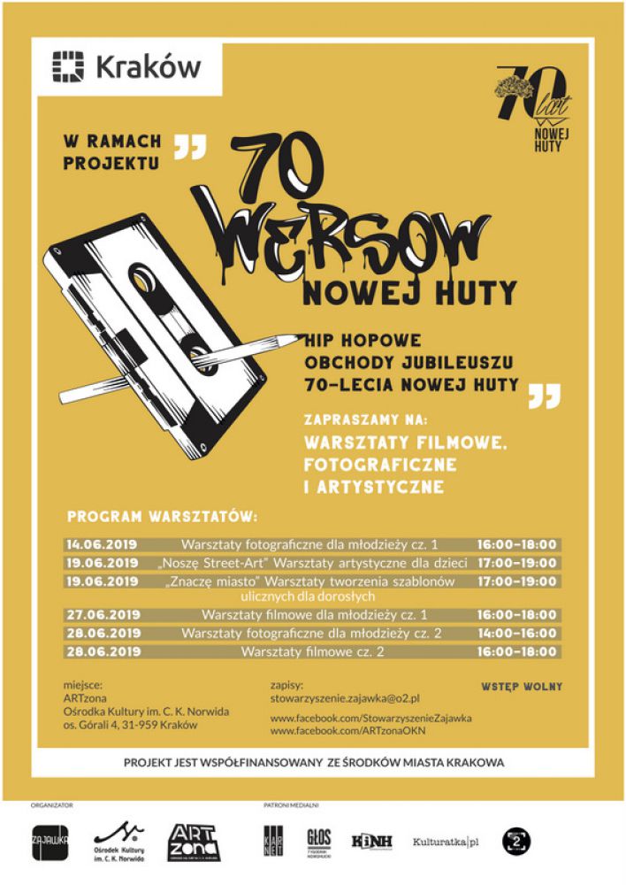 Warsztaty filmowe, fotograficzne i artystyczne w ramach projektu „70 wersów Nowej Huty – hip-hopowe obchody Jubileuszu 70-lecia Nowej Huty”