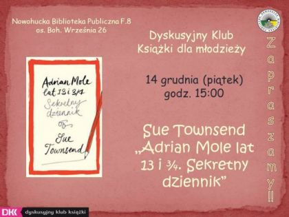Na kolejnym spotkaniu Modzieowego Dyskusyjnego Klubu Ksiki w cyklu: "Tu czytamy" omwiona zostanie angielska powie Sue Townsend. Stanowi ona cz bardzo popularnego cyklu, traktujcego o yciu tytuowego bohatera Adriana Molea. Wanie ksik o Adrianie Mole'u autorka rozpocza zawrotn karier pisarsk. Kolejne tomy ugruntoway sukces autorki na rynku wydawniczym.