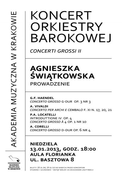 Akademia Muzyczna w Krakowie zaprasza na wyjtkowy Koncert Orkiestry Barokowej, na ktrym studenci oraz absolwenci wykonaj Concerti Grossi na instrumentach z epoki.