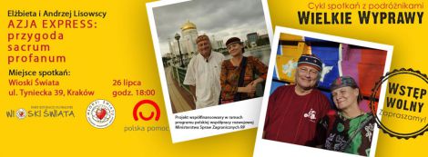 Gomi naszego ju kolejnego spotkania bd Elbieta oraz Andrzej Lisowscy, maestwo podrnikw i dziennikarzy, ktrzy wsplnie od lat przemierzaj azjatyckie tereny wiata. Kada ich podr dostarcza nowych dowiadcze, wrae i przey. Bd mieli okazj podzieli si nimi w czasie spotkania realizowanego w ramach cyklu Wielkie Wyprawy, ktrego cel(...)  ... więcej »