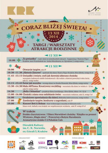 W programie wydarzenia znajduj si targi rkodziea oraz kiermasz ksiek czyli najlepsze propozycje na pikny prezent. Ambitni bd mogli wykona podarunek lub ozdob witeczn samodzielnie na 3 rodzajach rodzinnych warsztatw. Mionicy teatru, kina i muzyki take znajd co dla siebie! Nie sposb wymieni, trzeba to zobaczy!
