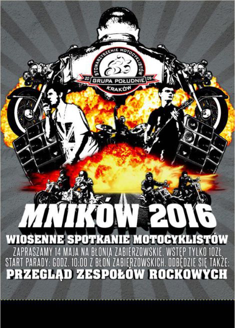 Zapraszamy na Przegld Kapel Rockowych Mnikw 2016 ktry odbdzie si podczas tegorocznego Wiosennego Spotkania Motocyklistw. Gwarantujemy fachowe nagonienie, profesjonalne jury oraz wietn zabaw. Dla uczestnikw nie zabraknie atrakcji dodatkowych poza samym przegldem.