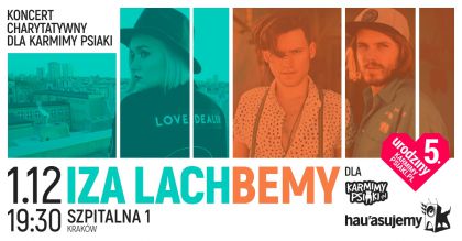 | Czwartkowy wieczr 1 grudnia bdzie nalea do Izy Lach i zespu BeMy. Artyci wystpi w krakowskim klubie Szpitalna 1 podczas charytatywnego koncertu "Hauasujemy gramy dla Karmimy Psiaki, organizowanego z okazji pitych urodzin akcji. Impreza jest okazj do poczenia zabawy z pomaganiem. To propozycja zarwno dla fanw muzyki jak i dla osb, ktre chc pomc bezdomnym Psiakom, poniewa dochd z wydarzenia zostanie przekazany na wsparcie m(...) ... więcej » |