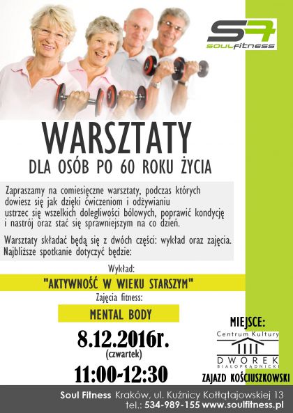 Dworek Biaoprdnicki zaprasza seniorw na zajcia podczas ktrych dowiedz si jak dziki wiczeniom i odywianiu, ustrzec si dolegliwoci blowych, poprawi kondycj i nastrj oraz sta si sprawniejszym na co dzie. Prowadzi je Klub Mionikw Aktywnego Wypoczynku - Soul Fitness. Najblisze spotkanie odbdzie si 8 grudnia. Wstp bezpatny.
