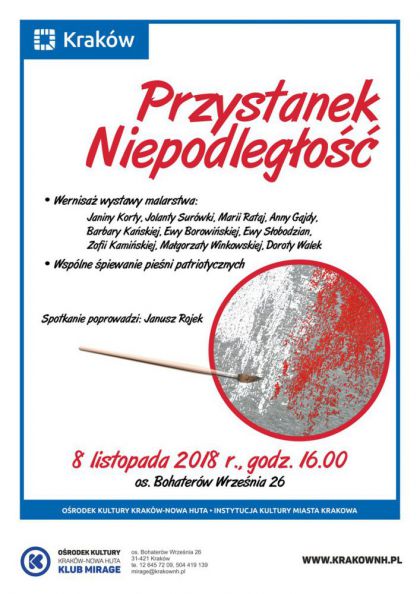 | Klub Mirage Orodka Kultury Krakw-Nowa Huta (os. Bohaterw Wrzenia 26) zaprasza 8na wernisa wystawy prac Janiny Korty, Jolanty Surwki, Marii Rataj, Anny Gajdy, Barbary Kaskiej, Ewy Borowiskiej, Ewy Sobodzian, Zofii Kamiskiej, Magorzaty Winkowskiej, i Doroty Walek. Wsplnym tematem dzie artystek jest niepodlego i obchodzone w tym roku stulecie jej odzyskania przez Polsk. Wernisaowi towarzyszy bdzie wsplne piewanie pieni patriot(...) ... więcej » |