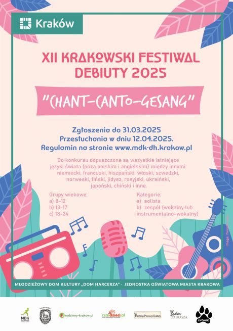 Młodzieżowy Dom Kultury „Dom Harcerza” w Krakowie zaprasza do udziału w XII edycji Krakowskiego Festiwalu Debiuty – wyjątkowego konkursu wokalnego, w którym uczestnicy wykonują utwory w językach innych niż polski i angielski.