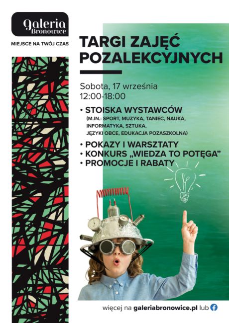 Nauka języka norweskiego, korepetycje z matematyki, zajęcia gry na perkusji, łyżwiarstwo figurowe, balet, a może akrobatyka? Galeria Bronowice zaprasza wszystkich rodziców, którzy szukają dla swoich pociech w wieku szkolnym ciekawych kursów i zajęć dodatkowych na Targi Zajęć Pozalekcyjnych. 17 września, w godz. 12.00-18.00, będzie można zapoznać się tu z szeroką ofertą blisko 40 wystawców. Na uczestników czekają tu także specjalne pokazy i warsztaty sprawdzające umiejętności uczniów w praktyce, a także konkurs „Wiedza to potęga”. Aby wziąć w nim udział, należy zrobić zakupy za min. 100 zł, zarejestrować paragon w Punkcie Obsługi Promocji i prawidłowo odpowiedzieć na pytania w quizie dotyczącym poszczególnych dziedzin naukowych. Nie zabraknie specjalnie przygotowanych na tę okazję promocji i rabatów w wybranych sklepach i punktach usługowych, znajdujących się na terenie centrum handlowego.