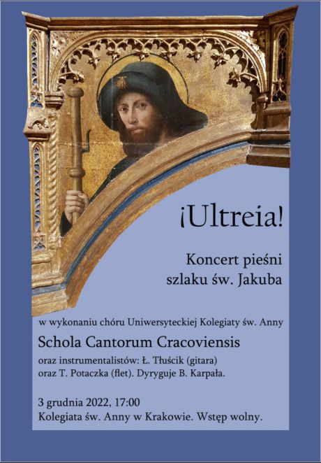 W dobie odradzania się – także w Polsce - szlaków św. Jakuba, chór Schola Cantorum Cracoviensis przy Akademickiej Kolegiacie św. Anny w Krakowie pragnie uczcić muzyką zakończenie Roku Świętego Św. Jakuba Większego. Chcąc choć w części wprowadzić słuchaczy w atmosferę pielgrzymowania do grobu Apostoła, poprowadzimy muzyczną drogą do Santiago de Compostela. Camino będzie wiodła poprzez wieki melodiami opartymi na chorale gregoriańskim, zapisanymi w Codexie Calixtinus w XII wieku, poprzez średniowieczne pieśni maryjne z Montserrat i renesansowe motety, aż po najnowsze pieśni pielgrzymów, które w naszych dniach powstają spontanicznie na drodze do Santiago. Będzie to również podróż poprzez kraje, którymi prowadzi z Polski Camino de Santiago, a więc w koncercie usłyszymy pieśni (oprócz polskich) niemieckie, francuskie i hiszpańskie. Barwy głosom chóralnym doda zespół instrumentów, które – muzykalny pielgrzym – zabiera na drogę, aby muzyką chwalić Boga, a napotkanym wędrowcom dodać sił.
