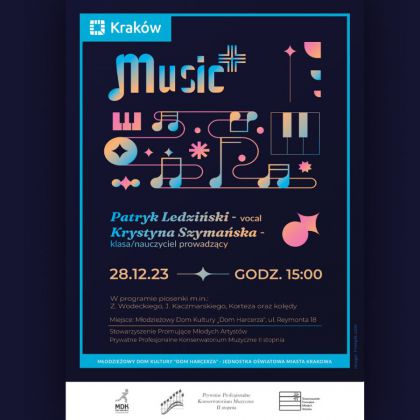 Serdecznie zapraszamy! 28 grudnia, godz. 15.00 do MDK "Dom Harcerza" na koncert piosenek w wykonaniu Patryka Ledzińskiego. W programie, m.in. piosenki Zbigniewa Wodeckiego, Jacka Kaczmarskiego, Korteza, a także kolędy.
