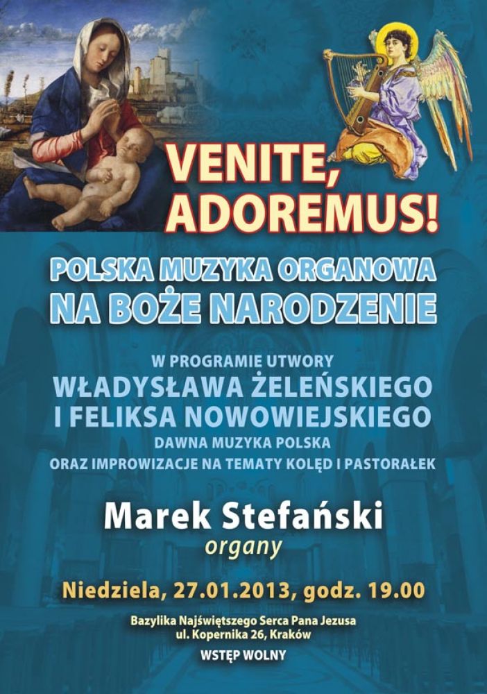 27 stycznia (niedziela) o godzinie 19:00 w Bazylice Jezuitów w Krakowie (ul. Kopernika 26) odbędzie się Koncert Bożonarodzeniowy. Polskš muzykę organowš Władysława Żeleńskiego, Feliksa Nowowiejskiego oraz improwizacje na tematy kolęd wykona Marek Stefański - jeden z najbardziej znanych krakowskich organistów. Wstęp na koncert bezpłatny. Serdecznie zapraszamy!