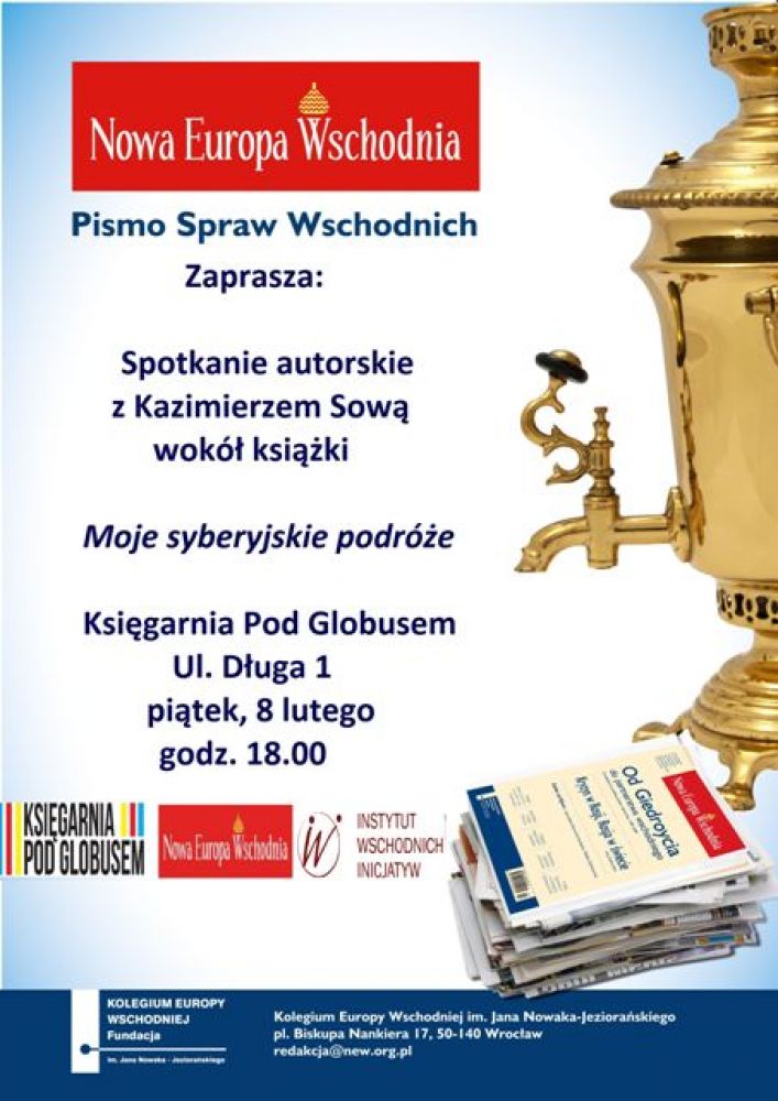 Dwumiesięcznik Nowa Europa Wschodnia, Księgarnia Pod Globusem i Instytut Wschodnich Inicjatyw zapraszajš na spotkanie autorskie duchownego, dziennikarza i publicysty Kazimierza Sowy wokół jego najnowszej ksišżki Moje syberyjskie podróże. Spotkanie odbędzie się w Księgarni Pod Globusem (ul. Długa 1, Kraków) 8 lutego o godz. 18.00.
