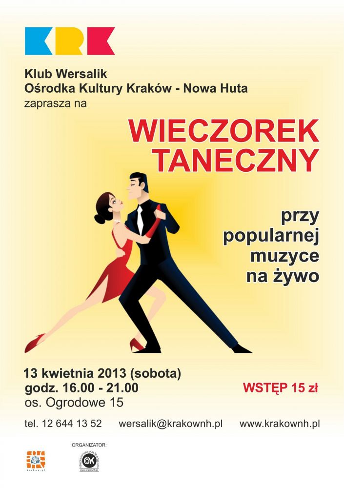 Propozycja dla osób, które chcš spędzić sobotni wieczór bawišc się na parkiecie. Zapraszamy do Klubu Wersalik Oœrodka Kultury Kraków-Nowa Huta(os. Ogrodowe 15) na wieczorek taneczny przy popularnej muzyce na żywo.