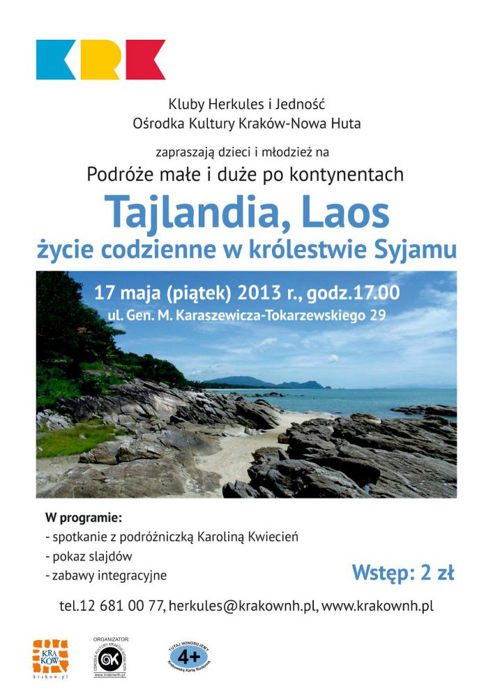 To kolejna odsłona cyklu Podróże małe i duże po kontynentach prowadzonego przez Kluby Herkules i Jednoœć Oœrodka Kultury Kraków-Nowa Huta. W programie wydarzenia znajdzie się: spotkanie z podróżniczkš Karolinš Kwiecień oraz pokaz slajdów, a także zabawy pokazujšce różnorodnoœć kulturowš w królestwie Syjamu.