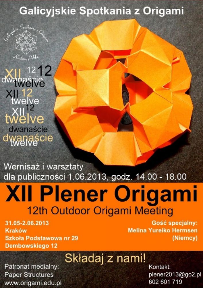 Galicyjska Grupa Origami i Galicyjski Oddział Polskiego Centrum Origami goršco zapraszajš młodzież i osoby dorosłe na XII Plener Origami (12th Outdoor Origami Meeting), cyklicznš międzynarodowš imprezę, od trzech lat odbywajšcš się w Krakowie.