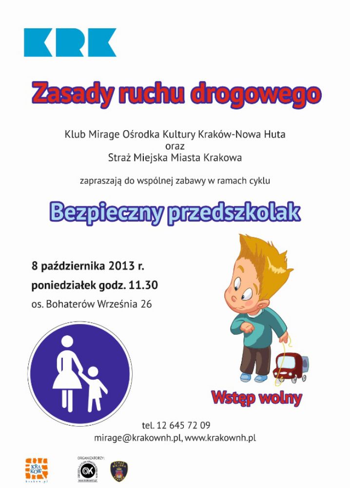 Bezpieczny przedszkolak to cykliczna impreza dla najmłodszych z zakresu bezpieczeństwa organizowana przez Klub Mirage Orodka Kultury Kraków-Nowa Huta (os. Bohaterów Wrzenia 26).