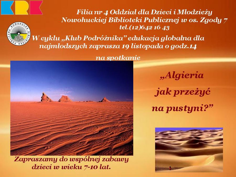 „Algieria – jak przeżyć na pustyni?” to kolejne spotkanie dla dzieci w cyklu „Klub Podróżnika – edukacja globalna dla najmłodszych”. Uczestnicy warsztatów poznajš Algierię – największe państwo w Afryce północnej, położone nad Morzem Œródziemnym. Poznajš klimat państwa, jego wpływ na życie mieszkańców, charakterystyczne miejsca, zabytki. Odbędš również podróż po największej goršcej pustyni na Ziemi – Saharze, która rozcišga się na długoœci 5700 kilometrów. Dzieci dowiedzš się, w jaki sposób zwierzęta i roœliny przystosowane sš do panujšcych warunków, a także poznajš charakterystyczne gatunki występujšce w tej strefie klimatycznej. Jeżeli ktoœ chce zwiedzić ten egzotyczny kraj, to zapraszamy do Biblioteki, by wybrać się w dalekš podróż.