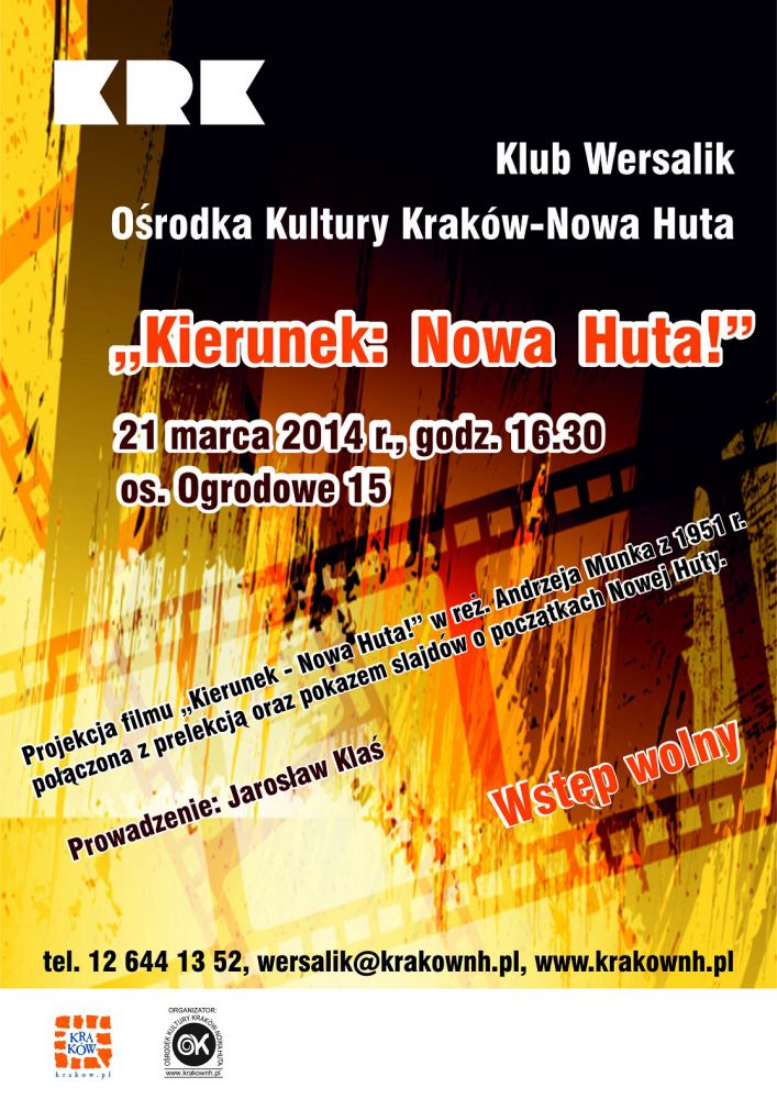 W programie wydarzenia, ktre odbdzie si 21 marca o godz. 16.30, projekcja filmu Kierunek Nowa Huta! w reyserii Andrzeja Munka z 1951 r. poczona z prelekcj oraz pokazem slajdw na temat powstania i pocztkw Nowej Huty. Spotkanie poprowadzi Jarosaw Kla kulturoznawca, doktorant Wydziau Zarzdzania i Komunikacji Spoecznej UJ, pasjonat Nowej Huty.