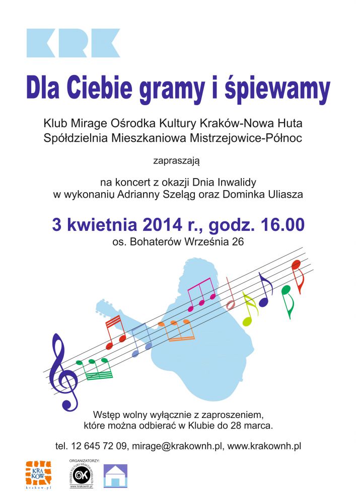 Klub Mirage Orodka Kultury Kraków-Nowa Huta (os. Bohaterów Wrzenia 26) zaprasza 3 kwietnia o godz. 16.00 na koncert z okazji Międzynarodowego Dnia Inwalidy, podczas którego w szlagierach muzycznych lat 60. i 70. wystšpi duet gitarowy: Adrianna Szelšg oraz Dominik Uliasz.