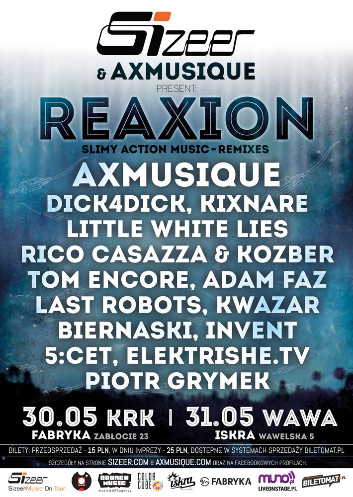 Podsumowaniem całego projektu Reaxion będš dwa niecodzienne wydarzenia z cyklu Sizeer Music On Tour, które odbędš się 30. maja w krakowskiej Fabryce i dzień póniej31. maja w warszawskiej Iskrze, gdzie na jednej scenie spotka się Dick4Dick, Kixnare, Little White Lies, Rico Casazza&Kozber, Tom Encore, Adam Faz, LastRobots, Kwazar, Biernaski, 5:cet, Elektrishe.TV, Piotr Grymek wraz z zespołem AXMusique.