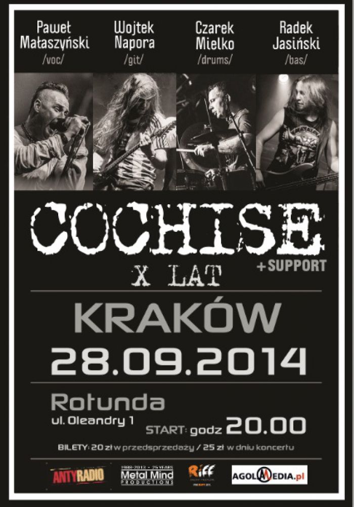 Cochise to zespół grajšcy muzykę, będšcš oryginalnym połšczeniem rocka, metalu i grunge’u. Grupa powstała w 2004 roku, ale aktywnš działalnoœć koncertowš i studyjnš rozpoczęła cztery lata temu, wydajšc debiutancki album „Still Alive”. Od tego czasu zespół zagrał ponad sto œwietnie przyjętych klubowych i plenerowych koncertów w całym kraju oraz nagrał dwie kolejne płyty wydane przez wytwórnie Mystic i Metal Mind. Premiera najnowszego kršżka „118” miała miejsce 10 lutego 2014.