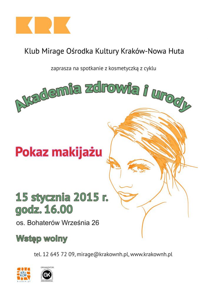 Klub Mirage Oœrodka Kultury Kraków-Nowa Huta zaprasza na kolejne spotkanie dla pań z cyklu Akademia zdrowia i urody. Tym razem tematem będzie Sztuka makijażu. Podczas krótkiego wykładu uczestniczki dowiedzš się jak zmęczonš, odwodnionš skórę wspomóc zabiegami domowymi i kosmetykami oraz jakie sš najnowsze trendy w kosmetyce kolorowej. W programie także prezentacja zabiegów na twarz oraz pokaz makijażu karnawałowego. Całoœć zakończš porady indywidualne.