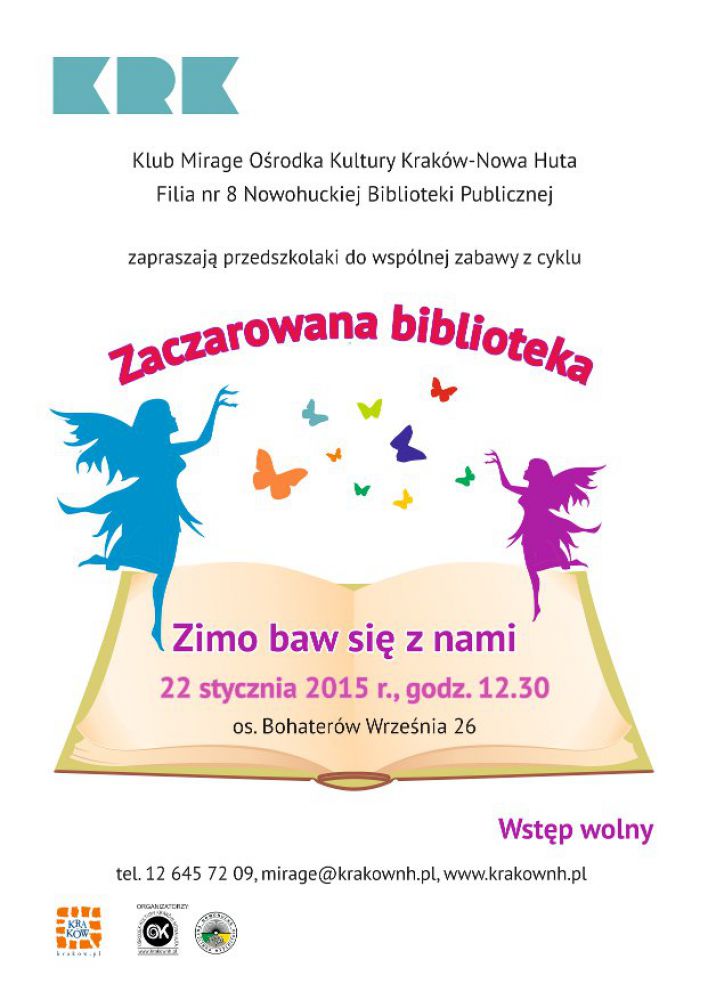 Klub Mirage Oœrodka Kultury Kraków-Nowa Huta zaprasza na zajęcia edukacyjno-relaksacyjne z elementami dramy i ćwiczeń oddechowych dla dzieci w wieku przedszkolnym w ramach cyklu Zaczarowana biblioteka. W tym miesišcu dzieci razem z bohaterami ksišżek przekonajš się, że zima wcale nie jest taka zła, a zimowe szaleństwo może się udzielić każdemu. Współorganizatorem cyklu jest Filia nr 8 Nowohuckiej Biblioteki Publicznej.