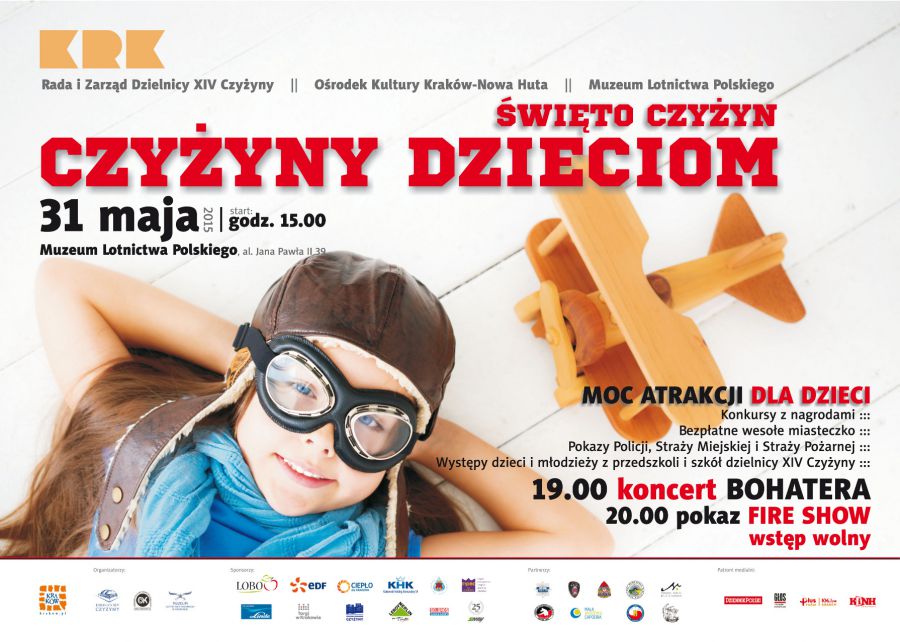 Przed nami 13 edycja festynu rodzinnego Œwięto Czyżyn. Czyżyny Dzieciom, która odbędzie się 31 maja br. w godz. 15.00-20.30 na terenie Muzeum Lotnictwa Polskiego (al. Jana Pawła II 39). Organizatorzy: Rada i Zarzšd Dzielnicy XIV Czyżyny, Oœrodek Kultury Kraków-Nowa Huta oraz Muzeum Lotnictwa Polskiego zapraszajš wszystkich mieszkańców Kraków, a zwłaszcza Czyżyn do wspólnego œwiętowania.