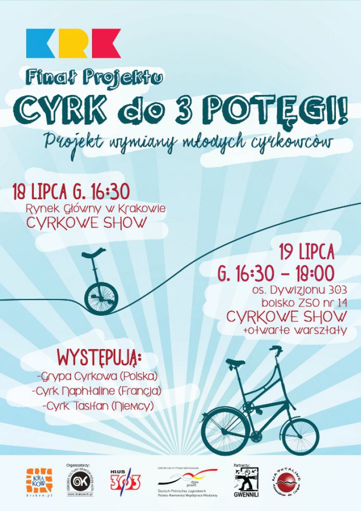 Młodzi cyrkowcy z Francji Cyrk Naphtaline, Niemiec Kinder- und Jugendzirkus Tasifan i Polski Grypa Cyrkowa z Orodka Kultury Kraków-Nowa Huta biorš udział w kolejnej odsłonie projektu cyrkowego CYRK do 3 POTĘGI, która tym razem ma miejsce w Krakowie.