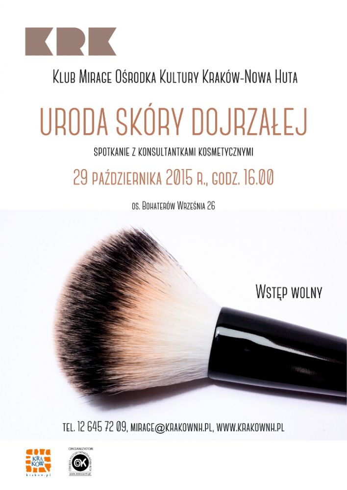 Spotkanie dla pań z konsultantkami kosmetycznymi w Klubie Mirage Orodka Kultury Kraków-Nowa Huta (os. Bohaterów Wrzenia 26). Cera dojrzała po menopauzie traci jędrnoć i prawidłowe napięcie. Po pięćdziesištce zmarszczki pogłębiajš się i zmienia się koloryt cery. Sztukš jest odkrycie linii kosmetyków, które spowolniš proces starzenia skóry oraz zamaskujš niedoskonałoci wynikajšce z upływu czasu. Spotkanie ze specjalistkami w tym temacie pomoże w znalezieniu najlepszych dla każdej kobiety kosmetyków, które znacznie spowolniš starzenie. Zapraszamy 29 padziernika o godz. 16.00.